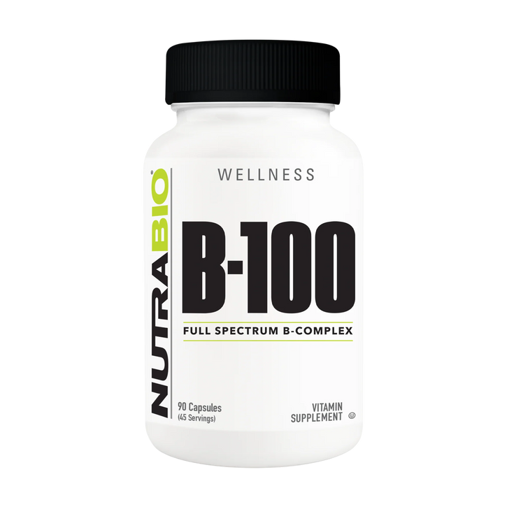 B-100 is a complete B-vitamin complex designed to support energy metabolism, nervous system health, and resilience under stress. NutraBio distinguishes itself with clinical dosing and full label transparency.