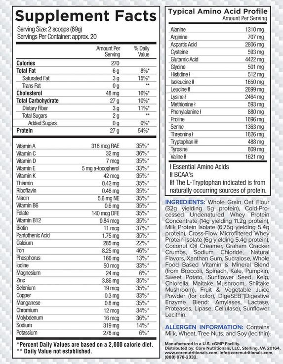 Ingredients (per serving): Whey Protein Isolate, Milk Protein Isolate, Oats, Flaxseed, MCTs, vitamins & minerals, natural & artificial flavors.